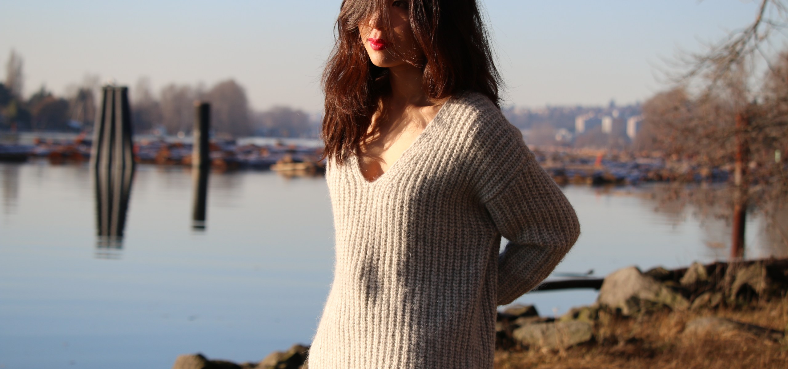 For girls who are petite like me, a longer oversized sweater can even turn into a sweater dress! I love to belt it up and wear it with a pair of over-the-knee boots since it gives me a more dressy look. If you don’t mind layering, wearing a solid colour button down underneath can add a different element to your stylish look. Because of the oversized fit and chunky material, I usually don’t wear a coat with it to avoid making me look too “heavy”. So I just put on my blanket scarf as my outerwear to keep me warm yet stylish. And of course a pair of heels can always elevate the sweater look. Next time you wear your oversized sweaters, think outside the box and you may surprise yourself!
